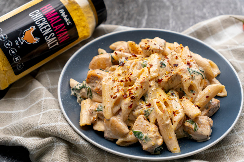 Savory meets smooth-Chicken salt on creamy garlic chicken pasta. This unique seasoning elevates the pasta, provides the deliciously unique twist that makes each bite even more satisfying.